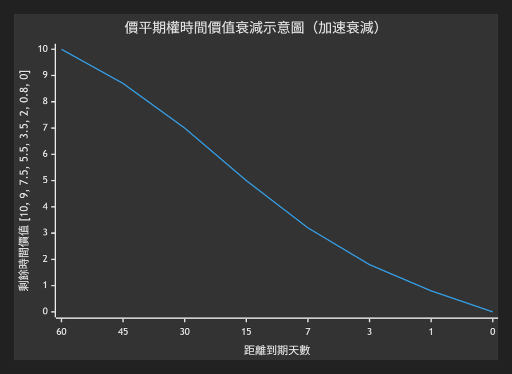 Theta 的數值並非固定不變,它主要受以下三個因素影響:1. 到期時間的長短:時間價值「加速衰減」這是 Theta 最顯著的特徵:衰減速度並非線性,而是呈加速狀態。下圖清晰地展示了這一關鍵現象: